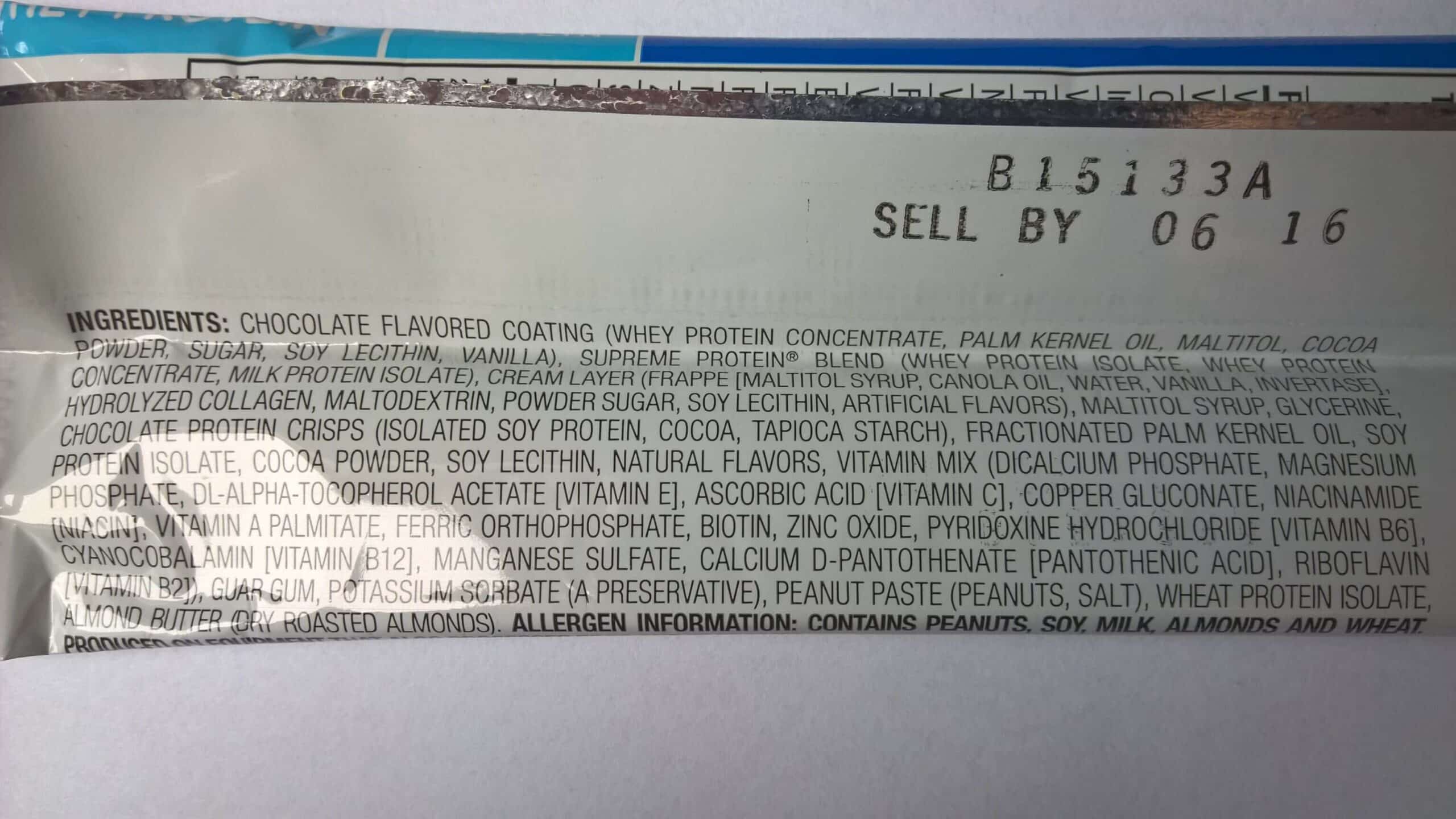 Beim Schokoladenüberzug des Riegels setzt Supreme auf Molkeneiweiß-Konzentrat, Kakao, Zucker und Vanille. Die Proteinmischung ist ein Mehrkomponenteneiweiß Supreme Protein Blend aus Molkeneiweiß-Isolat, Molkeneiweiß-Konzentrat und Milcheiweiß-Isolat. Auch wurden Kollagen-Hydrolysat, Maltodextrin, Puderzucker, Soja-Lecithin und andere Zutaten verarbeitet. Die Schokoladen-Protein-Crisps bestehen aus Sojaeiweiß-Isolat. Zusätzlich ist ein Vitamin Mix vorhanden, der unter anderem Magnesium, Vitamin E, Vitamin C, Niacin, Vitamin A, Biotin, Zink, Vitamin B6, Vitamin B12, Calcium und Vitamin B2 enthält. Zusätzlich ist Erdnusspaste, Weizeneiweiß-Isolat und Erdnussbutter verarbeitet.